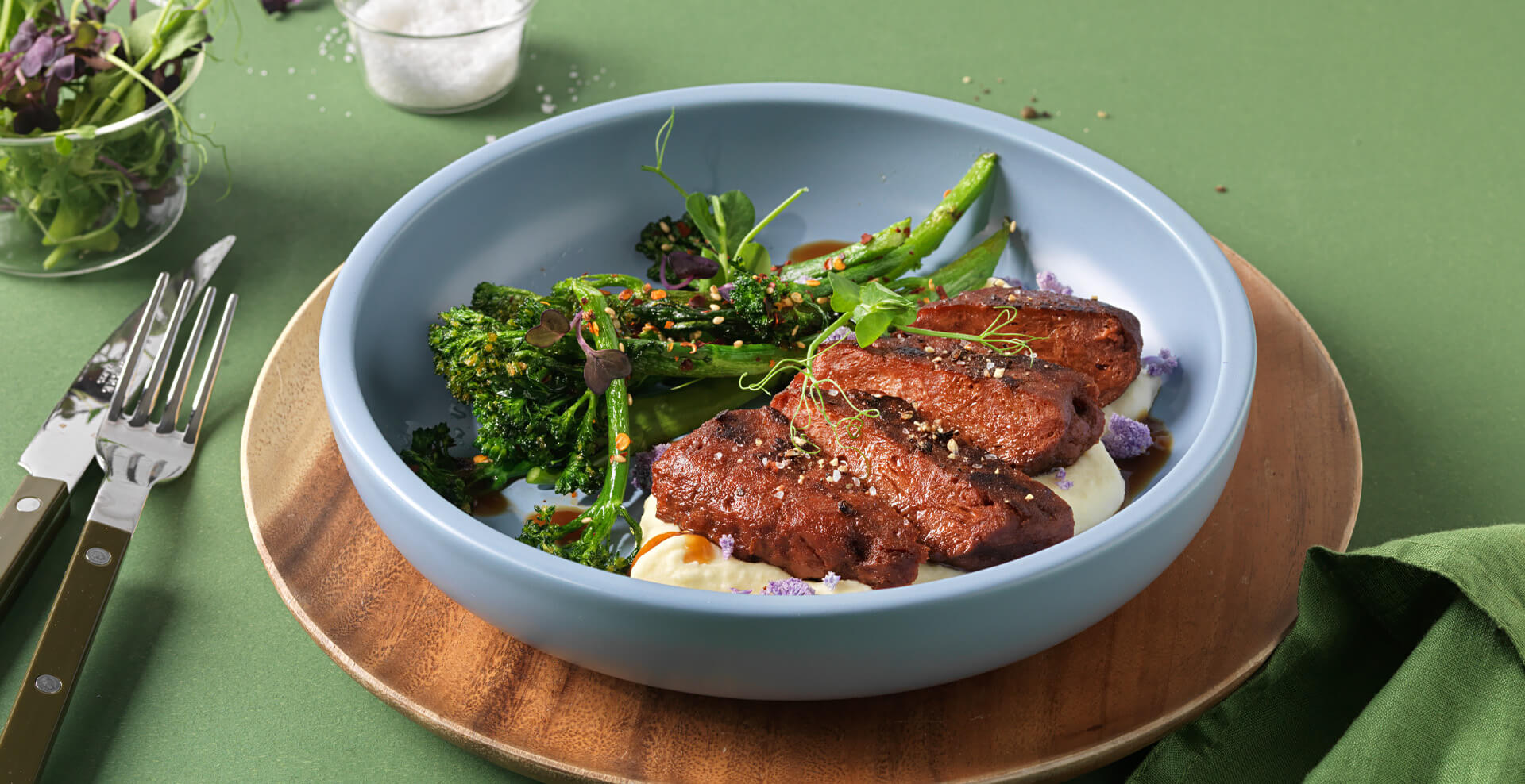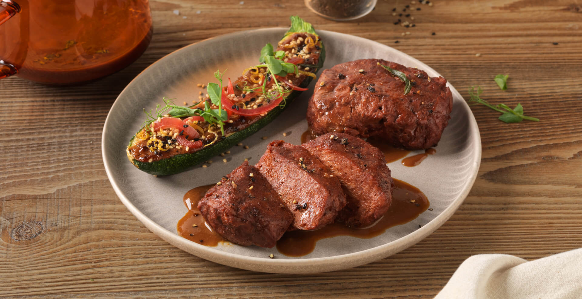Das plant-based Gourmetsteak tranchieren und mit der Balsamico-Bratensauce auf dem Teller anrichten.